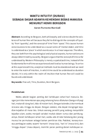 Aaron, Purnomo Murniadi (2022) Waktu intuitif (durasi)sebagai dasar adanya kehendak bebas manusia menurut Henri Bergson. Driyarkara Jurnal Filsafat, 42 (2): 5. pp. 81-91. ISSN 2809-9516