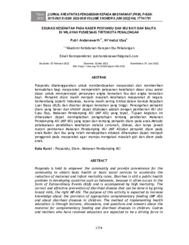 Putri, Andanawarih and Ni’matul, Uly (2022) Edukasi kesehatan pada kader posyandu dan ibu bayi dan balita di wilayah puskesmas tirtokota Pekalongan. Jurnal Kreativitas Pengabdian kepada Masyarakat, 5 (6): 21. pp. 1774-1781. ISSN 2622-6030