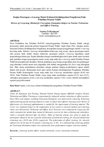 Handayani, Yustina Tri (2017) Kajian Penerapan e-Learning Materi Estimasi Ketidakpastian Pengukuran Pada Pelatihan Pranata Nuklir (Review of e-Learning Method for Uncertainty Estimation Subject on Nuclear Technician and Officer Training). Widyanuklida, 16 (1). pp. 50-56. ISSN 1410-5357
