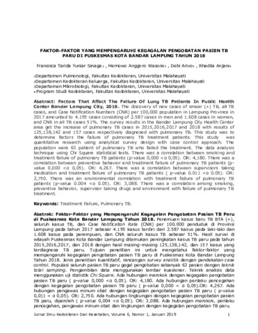Fransisca, Tarida Yuniar Sinaga and Hernowo, Anggoro Wasono and Debi, Arivo and Rhadila, Anjani (2019) Faktor-faktor yang mempengaruhi kegagalan pengobatan pasien TB paru di Puskesmas kota Bandar lampung tahun 2018. Jurnal Ilmu Kedokteran dan Kesehatan, 6 (1). pp. 1-11. ISSN 2549-4864