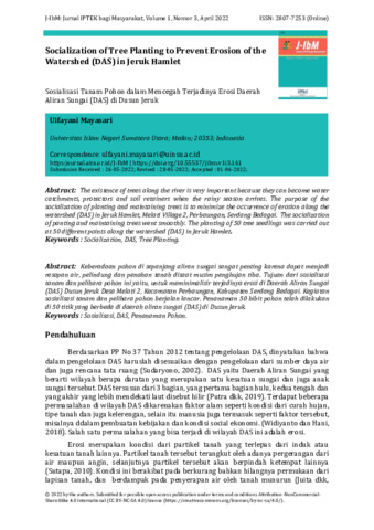 Ulfayani, Mayasari (2022) Sosialisasi tanam pohon dalam mencegah terjadinya erosi Daerah Aliran Sungai (DAS) di Dusun Jeruk. Jurnal IPTEK Bagi Masyarakat, 1 (3): 4. pp. 125-130. ISSN 2807-7261