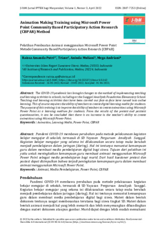 Raissa, Amanda Putri and Triase, Triase and Aninda, Muliani and Mega, Andriani (2022) Pelatihan pembuatan animasi menggunakan Microsoft Power Point metode Community Based Participatory Action Research (CBPAR). Jurnal IPTEK Bagi Masyarakat, 1 (3): 5. pp. 131-138. ISSN 2807-7261