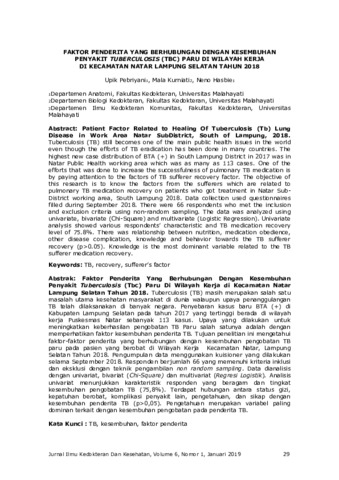 Upik, Pebriyani and Mala, Kurniati and Neno, Hasbie (2019) Faktor penderita yang berhubungan dengan kesembuhan Penyakit Tuberculosis (TBC) Paru di wilayah kerja di kecamatan Natar lampung Selatan tahun 2018. Jurnal Ilmu Kedokteran dan Kesehatan, 6 (1). pp. 29-37. ISSN 2549-4864