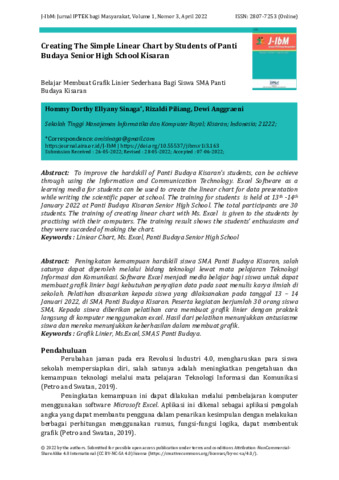 Peningkatan kemampuan hardskill siswa SMA Panti Budaya Kisaran, salah satunya dapat diperoleh melalui bidang teknologi lewat mata pelajaran Teknologi Informasi dan Komunikasi. Software Excel menjadi media belajar bagi siswa untuk dapat membuat grafik linier bagi kebutuhan penyajian data pada saat menulis karya ilmiah di sekolah. Kegiatan pengabdian kepada masyarakat yang dilakukan tim dosen STMIK Royal Kisaran pada tanggal 13 – 14 Januari 2022, di SMA Panti Budaya Kisaran. Peserta kegiatan berjumlah 30 orang siswa SMA. Kepada siswa diberikan pelatihan cara membuat grafik linier dengan praktek langsung di komputer menggunakan excel. Hasil dari pelatihan menunjukkan antusiasme siswa dan mereka menunjukkan keberhasilan dalam membuat grafik.