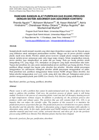 Rnanda, Agustin and Muharom, Muharom and M., Hasan Abdullah and Astria, Hindratmo and Chendrasari, Wahyu Oktavia and Wahyu, Nugroho and Mochammad, Muchid (2022) Rancang bangun alat purifikasi gas buang pirolisis dengan sistem absorber dan adsorber kontinyu. The Journal of System Engineering and Technological Innovation, 1 (2): 6. pp. 71-76. ISSN 2828-4003