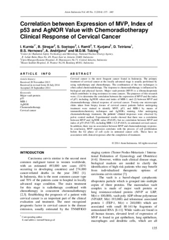 Kurnia, Iin and Devita, Tetriana (2014) Correlation between Expression of MVP, Index of p53 and AgNOR Value with Chemoradiotherapy Clinical Response of Cervical Cancer. Atom Indonesia, 40 (3). pp. 135-140. ISSN 0126-1568