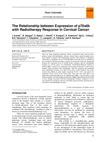 Iin, Kurnia and Teja, Kisnanto and Devita, Tetriana and Yanti, Lusiyanti (2016) The Relationship between Expression of p70s6k with Radiotherapy Response in Cervical Cancer. Atom Indonesia, 42 (1). pp. 33-38. ISSN 0126-1568