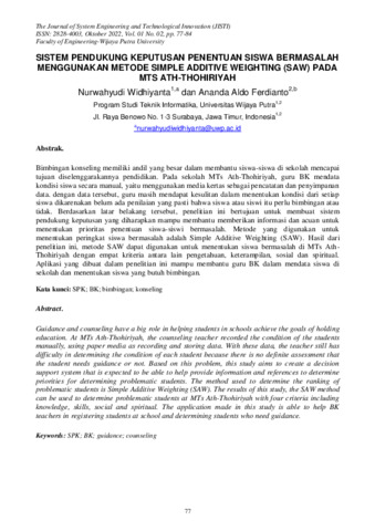 Nurwahyudi, Widhiyanta and Ananda, Aldo Ferdianto (2022) Sistem pendukung keputusan penentuan siswa bermasalah menggunakan metode Simple Additive Weighting (SAW) pada MTs Ath-Thohiriyah. The Journal of System Engineering and Technological Innovation, 1 (2): 7. pp. 77-84. ISSN 2828-4003