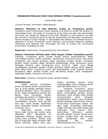 Annisa, Mulia Anasis (2019) Perubahan perilaku pada tikus dengan infeksi Toxoplasma gondii. Jurnal Ilmu Kedokteran dan Kesehatan, 6 (1). pp. 49-56. ISSN 2549-4864