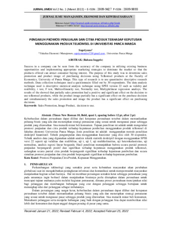 Keberhasilan dalam perusahaan dapat dilihat dari ketepatan perusahaan tersebut dalam memanfaatkan peluang bisnis yang ada dan menerapkan strategi pemasaran yang sesuai untuk menguasai pasar sehingga produk yang ditawarkan bisa menarik minat beli konsumen. Tujuan penelitian ini adalah untuk mengetahui promosi penjualan dan citra produk terhadap keputusan pembelian menggunakan produk telkomsel di fakultas ekonomi Universitas Panca Marga. Jenis penelitian ini adalah menggunakan metode penelitian deskriptif kuantitatif. Tehnik pengumpulan data menggunakan kuesioner yang diisi oleh 30 responden. Tehnik analisis data yang digunakan adalah analisis teknik statistik deskriptif dengan menggunakan SPSS versi 22 seperti uji validitas dan realibilitas, uji t, uji f, uji multikolineritas, uji heterokedastisitas, uji normalitas, analisis regresi linear berganda. Hasil penelitian menunjukkan bahwa secara parsial promosi penjualan berpengaruh positif dan signifikan terhadap keputusan menggunakan produk telkomsel, sedangkan secara parsial citra produk berpengaruh signifikan terhadap keputusan pembelian dan secara simultan promosi penjualan dan citra produk berpengaruh signifikan terhadap keputusan pembelian.