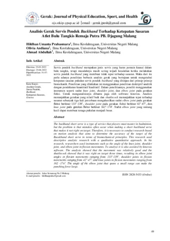 Hildhan, Umanta Prabasmara and Olivia, Andiana and Ahmad, Abdullah (2022) Analisis gerak servis pendek backhand terhadap ketepatan sasaran atlet bulu tangkis remaja putra PB. Djagung Malang. Gerak: Journal of Physical Education, Sports, and Health, 2 (2): 2. pp. 49-56. ISSN 2828-5433