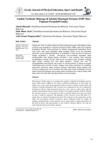 Alimin, Hamzah and Muh., Ilham Aksir and Andi, Atssam Mappanyukki (2022) Analisis textbook olahraga di Sekolah Menengah Pertama (SMP) dari tinjauan perspektif gender. Gerak: Journal of Physical Education, Sports, and Health, 2 (2): 4. pp. 62-66. ISSN 2828-5433