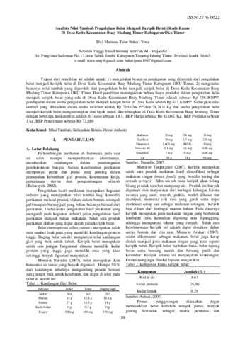 Dwi, Mutiara and Tutut, Bahari Yona (2021) Analisis nilai tambah pengolahan belut menjadi keripik belut (study kasus) di Desa Kedu Kecamatan Buay Madang Timur Kabupaten Oku Timur. Jurnal Bakti Agribisnis, 7 (2): 5. pp. 39-44. ISSN 2776-0022