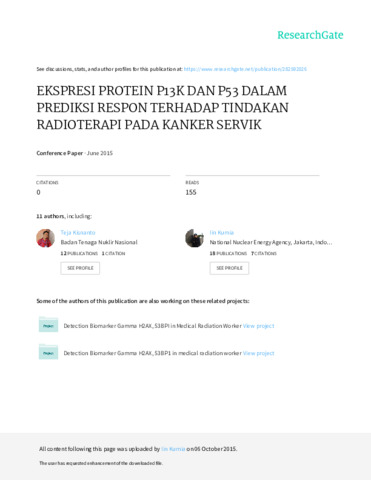 Teja, Kisnanto and Devita, Tetriana and Iin, Kurnia (2015) EKSPRESI PROTEIN P13K DAN P53 DALAM PREDIKSI RESPON TERHADAP TINDAKAN RADIOTERAPI PADA KANKER SERVIK. Prosiding Seminar PSTA. pp. 94-100. ISSN 0216 - 3128
