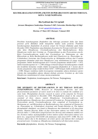 Ria, Syafriani and Tri, Apriadi (2017) Keanekaragaman fitoplankton di perairan estuari Sei Terusan, Kota Tanjungpinang. Limnotek : Perairan Darat Tropis di Indonesia, 24 (2): 3. pp. 74-82. ISSN 2549-8029