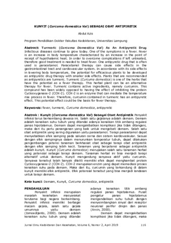 Abdul, Azis (2019) Kunyit (Curcuma domestica Val.) sebagai obat antipiretik. Jurnal Ilmu Kedokteran dan Kesehatan, 6 (2). pp. 116-120. ISSN 2549-4864