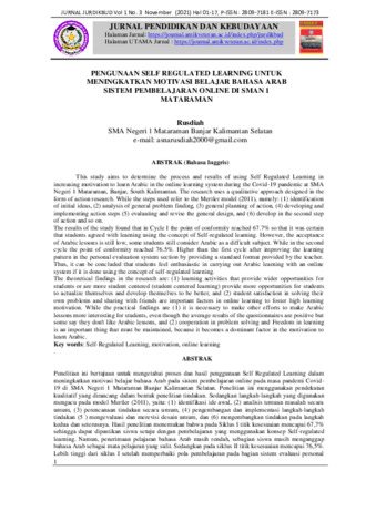 Penelitian ini bertujuan untuk mengetahui proses dan hasil penggunaan Self Regulated Learning dalam meningkatkan motivasi belajar bahasa Arab pada sistem pembelajaran online pada masa pandemi Covid-19 di SMA Negeri 1 Mataraman Banjar Kalimantan Selatan. Penelitian ini menggunakan pendekatan kualitatif yang dirancang dalam bentuk penelitian tindakan. Sedangkan langkah-langkah yang digunakan mengacu pada model Mertler (2011), yaitu: (1) identifikasi ide awal, (2) analisis temuan masalah secara umum, (3) perencanaan tindakan secara umum, (4) pengembangan dan implementasi langkah-langkah tindakan (5 ) mengevaluasi dan merevisi desain umum, dan (6) mengembangkan tindakan pada langkah kedua dan seterusnya. Hasil penelitian menemukan bahwa pada Siklus I titik kesesuaian mencapai 67,7% sehingga dapat dipastikan siswa setuju dengan pembelajaran yang menggunakan konsep Self-regulated learning. Namun, penerimaan pelajaran bahasa Arab masih rendah, sebagian siswa masih menganggap bahasa Arab sebagai mata pelajaran yang sulit. Sedangkan pada siklus II titik kesesuaian mencapai 76,5%. Lebih tinggi dari siklus I setelah memperbaiki pola pembelajaran pada bagian sistem evaluasi personal dengan memberikan format standar yang disediakan oleh guru. Dengan demikian, dapat disimpulkan bahwa siswa merasa antusias dalam melaksanakan pembelajaran bahasa Arab dengan sistem online jika dilakukan dengan menggunakan konsep self-regulated learning.Temuan teoritis dalam penelitian ini adalah: (1) kegiatan pembelajaran yang memberikan kesempatan yang lebih luas kepada siswa atau lebih berpusat pada siswa (student centeredlearning) memberikan lebih banyak kesempatan kepada siswa untuk mengaktualisasikan diri dan mengembangkan diri menjadi lebih baik, dan (2) kepuasan siswa dalam memecahkan masalah sendiri dan berbagi dengan teman merupakan faktor penting dalam pembelajaran online untuk menumbuhkan motivasi belajar yang tinggi. Sedangkan temuan praktisnya adalah (1) perlu dilakukan upaya lain agar pelajaran bahasa Arab lebih menarik bagi siswa, walaupun rata-rata hasil angket positif tetapi ada yang mengatakan tidak menyukai pelajaran bahasa Arab, dan (2) kerjasama dalam pemecahan masalah dan Kebebasan dalam belajar merupakan hal penting yang harus dijaga, karena menjadi faktor dominan dalam motivasi belajar bahasa Arab