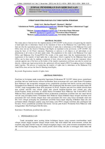 Aziz, Abdul and Harlina, Hamid and Djuniarti, Djuniarti and Habiba, Habiba (2021) Pendaftaran peralihan hak atas tanah karena pewarisan. Jurnal Pendidikan dan Kebudayaan, 1 (3). pp. 18-27. ISSN 2809-7181