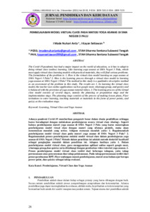 Adanyapandemi Covid-19 memberikan pengaruh besar dalam dunia pendidikansehinggaharus beradaptasi dengan melakukan pembelajaran secara virtual class (daring).Seperti halnya pembelajaran materi yoga asanas di SMA Negeri 3 Paluyang harus menerapkan pembelajaran model virual class dengan materi yang sifatnya praktik, maka akan menemukan masalah yang serius.Adapun rumusan masalah yaitu:1. Bagaimanakah pembelajaran model virtual class pada materi yoga asanas di SMA Negeri 3 Palu?2. Bagaimanakah proses pembelajaran melalui model virtual class dalam pembelajaran yoga asanas di SMA Negeri 3 Palu?Metodedalam penelitian ini adalah metode deskritif kualitatifsebagai pengkajian masalah dalam penelitian ini.Adapun hasilnya yaitu1. Dalam pembelajaran model virtual class, gurumenggunakan aplikasi online seperti google meet, whatsapp group,danquizizzserta diimbangi dengan pemberian video tutorial yoga asanas. 2. Proses pembelajaran model virtual class terdiri dari beberapa tahapan, yaitu tahap perencanaan atau penyususnan dan tahap pelaksanaan. Pada tahap perencanaan terdiri dari proses pembuatan RPP, Flyer undangan masuk pembelajaran, materi atau bahan ajar berupa power point, dan quizizz sebagai tahap evaluasi.