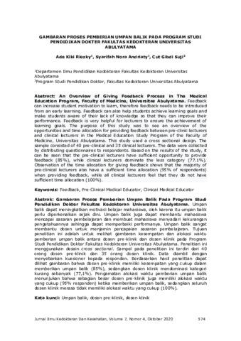 Ade Kiki, Riezky and Syarifah Nora, Andriaty and Cut Gibdi, Suji (2020) Gambaran proses pemberian umpan balik pada program studi pendidikan dokter Fakultas Kedokteran Universitas Abulyatama. Jurnal Ilmu Kedokteran dan Kesehatan, 7 (4): 4. 574 -578. ISSN 2355-7583
