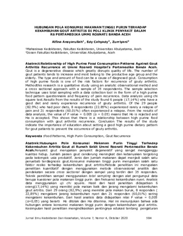 Alfina, Ansyarullah and Edy, Cahyady and Zurriyani, Zurriyani (2020) Hubungan pola konsumsi makanan tinggi purin terhadap kekambuhan gout artritis di poli klinik penyakit dalam RS Pertamedika Ummi Rosnati Banda Aceh. Jurnal Ilmu Kedokteran dan Kesehatan, 7 (4): 6. 584 -592. ISSN 2355-7583