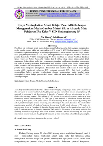 Nur, Rahmi and Febri, Isnawati (2021) Upaya meningkatkan minat belajar peserta didik dengan menggunakan media gambar materi siklus air pada mata pelajaran IPA Kelas V SDN Sindangbarang 05. Jurnal Pendidikan dan Kebudayaan, 1 (3). pp. 110-121. ISSN 2809-7181
