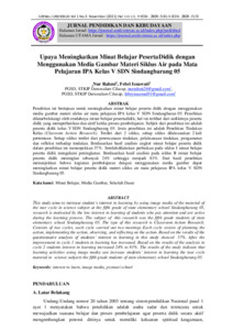 Penelitian ini bertujuan untuk meningkatkan minat belajar peserta didik denganmenggunakan media gambar materi siklus air mata pelajaran IPA kelas V SDNSindangbaran 05. Penelitian dilatarbelakangi oleh rendahnya minat belajar pesertadidik, hal ini terlihat dari sedikitnya peserta didik yang memperhatikan dan aktifketika proses pembelajaran. Subjek dari penelitian ini adalah peserta didik kelas VSDN Sindangbarang 05. Jenis penelitian ini adalah Penelitian Tindakan Kelas(ClasroomActionResearch).Terdiridari2siklus,setiapsiklusdilaksanakan2kalipertemuan.Setiapsiklusterdiridariperencanaantindakan,pelaksanaantindakan, pengamatan dan refleksi terhadap tindakan. Berdasarkan hasil analisisangket minat belajar peserta didik dalam penelitian ini menunjukkan 57%. SetelahdilakukanperbaikanpadasiklusIminatbelajarpesertadidikmengalamipeningkatan. Berdasarkan hasil analisis pada siklus II minat belajar peserta didikmeningkatsebanyak24%sehinggamenjadi81%.Darihasilpenelitianmenunjukkan bahwa kegiatan pembelajaran dengan menggunakan media gambardapat meningkatkan minat belajar peserta didik materi siklus air mata pelajaranIPAkelas VSDNSindangbarang05.