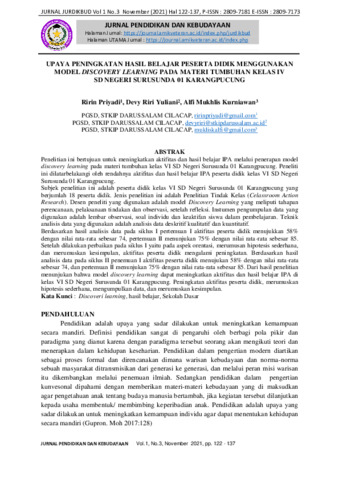 Ririn, Priyadi and Devy, Riri Yuliani and Alfi, Mukhlis Kurniawan (2021) Upaya peningkatan hasil belajar peserta didik menggunakan model discovery learning pada materi tumbuhan kelas IV SD Negeri Surusunda 01 Karangpucung. Jurnal Pendidikan dan Kebudayaan, 1 (3). pp. 122-137. ISSN 2809-7181