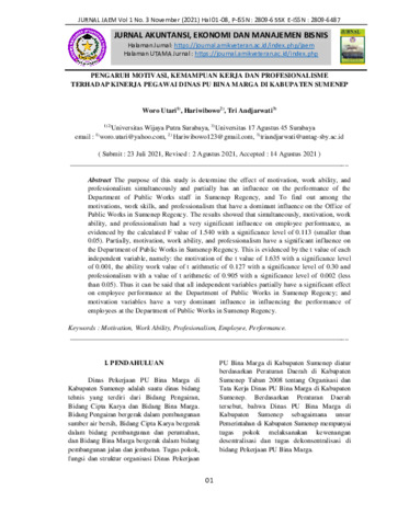 Woro, Utari and Hariwibowo, Hariwibowo and Tri, Andjarwati (2021) Pengaruh motivasi, kemampuan kerja dan profesionalisme terhadap kinerja pegawai dinas PU Bina Marga di Kabupaten Sumenep. Jurnal Akuntansi, Ekonomi dan Manajemen Bisnis, 1 (3). pp. 1-8. ISSN 2809-655X