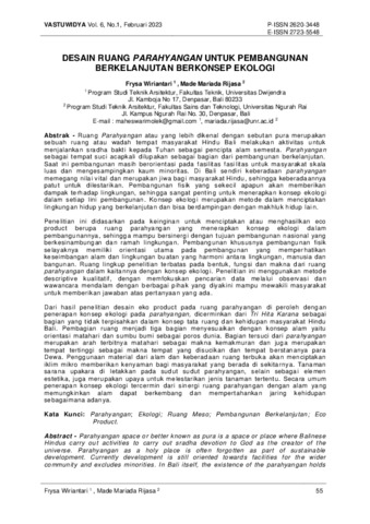 Frysa, Wiriantari and Made, Mariada Rijasa (2023) Desain ruang parahyangan untuk pembangunan berkelanjutan berkonsep ekologi. Jurnal Ilmiah VASTUWIDYA, 6 (1). pp. 55-63. ISSN 2620-3448