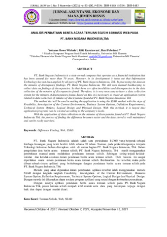 Yohanes, Bowo Widodo and Kiki, Kurniawan and Reni, Febrianti (2021) Analisis pendataan berita acara temuan selisih berbasis web pada PT Bank negara Indonesia, Tbk. Jurnal Akuntansi, Ekonomi dan Manajemen Bisnis, 1 (3). pp. 93-100. ISSN 2809-655X