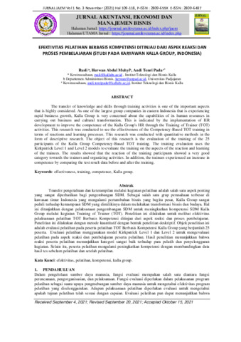 Rusli, Rusli and Herwan, Abdul Muhyi and Andi, Tenri Pada (2021) Efektivitas pelatihan berbasis kompetensi ditinjau dari aspek reaksi dan proses pembelajaran (studi pada karyawan Kalla Group, Indonesia). Jurnal Akuntansi, Ekonomi dan Manajemen Bisnis, 1 (3). pp. 109-118. ISSN 2809-655X