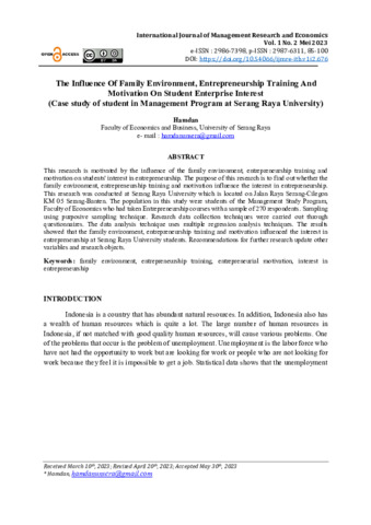 Hamdan, Hamdan (2023) The influence of family environment, entrepreneurship training and motivation on student enterprise interest (Case study of student in Management Program at Serang Raya University). International Journal of Management Research and Economics, 1 (2). pp. 85-100. ISSN 2987-6311