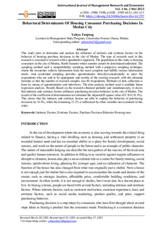 Yahya, Tanjung (2023) Behavioral determinants of housing consumer purchasing decisions In Medan City. International Journal of Management Research and Economics, 1 (2). pp. 101-117. ISSN 2987-6311