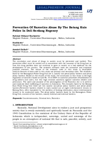 Rahmat, Hidayat Syahputra and Kusbianto, Kusbianto and Azmiati, Zuliah (2022) Prevention of narcotics abuse by the Batang Kuis police in Deli Serdang Regency. Legalpreneur Journal, 1 (1): 5. pp. 35-48. ISSN 2962-0961