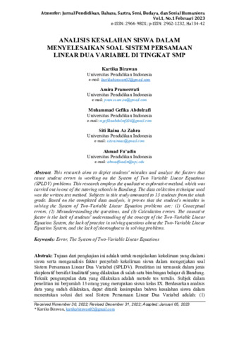 Kartika, Birawan and Amira, Prameswati and Muhammad, Gefika Abdulrafi and Siti, Raina Az Zahra and Ahmad, Fu’adin (2023) Analisis kesalahan siswa dalam menyelesaikan soal sistem persamaan linear dua variabel di tingkat SMP. Atmosfer: Jurnal Pendidikan, Bahasa, Sastra, Seni, Budaya, dan Sosial Humaniora, 1 (1). pp. 34-42. ISSN 2962-1232