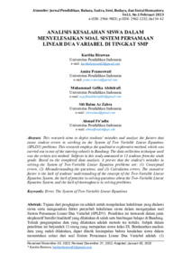 Tujuan dari pengkajian ini adalah untuk menjelaskan kekeliruan yang dialami siswa serta menganalisis faktor penyebab kekeliruan siswa dalam mengerjakan soal Sistem Persamaan Linear Dua Variabel (SPLDV). Penelitian ini termasuk dalam jenis eksploratif bersifat kualitatif yang dilakukan di salah satu bimbingan belajar di Bandung. Teknik pengumpulan data yang dilakukan adalah metode tes tertulis. Subjek dalam penelitian ini berjumlah 13 orang yang merupakan siswa kelas IX. Berdasarkan analisis data yang sudah dilakukan, dapat ditarik kesimpulan bahwa kesalahan siswa dalam menentukan solusi dari soal Sistem Persamaan Linear Dua Variabel adalah: (1)Kekeliruan konsep, (2) Kesalahpahaman dalam memahami soal, (3) Kekeliruan hitung. Faktor penyebabnya adalah kurangnya pemahaman siswa mengenai konsep Sistem Persamaan Linear Dua Variabel, kurangnya latihan menyelesaikan soa-soal Sistem Persamaan Linear Dua Variabel dan kurangnya ketelitian dalam menentukan solusi dari soal.