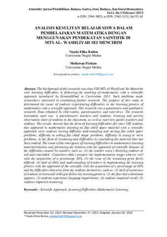 Nanda, Elika Rahim and Muliawan, Firdaus (2023) Analisis kesulitan belajar siswa dalam pembelajaran matematika dengan menggunakan pendekatan Saintifik di MTS Al- Washliyah Sei Mencirim. Atmosfer: Jurnal Pendidikan, Bahasa, Sastra, Seni, Budaya, dan Sosial Humaniora, 1 (1). pp. 52-61. ISSN 2962-1232