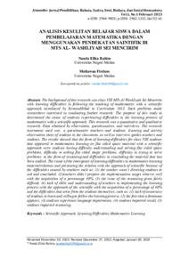 Latar belakang penelitian ini adalah siswa kelas VIII MTs Al Washliyah Sei Mencirim mengalami kesulitan belajar dalam mengikuti pembelajaran matematika dengan pendekatan saintifik yang dikenalkan oleh kemendikbud dalam Kurikulum 2013. Permasalahan tersebut membuat peneliti tertarik melakukan penelitian lebih lanjut. Tujuan penelitian ini untuk mengetahui penyebab siswa mengalami kesulitan dalam mengikuti proses pembelajaran matematika dengan pendekatan saintifik. Jenis penelitian ini adalah penelitian kuantitatif dan kualitatif. Data diperoleh dengan melakukan observasi, penyebaran angket, dan wawancara. Instrumen penelitian yang dipakai adalah angket guru dan siswa, lembar observasi pembelajaran dan aktivitas siswa di kelas, serta pedoman wawancara guru dan siswa. Hasil penelitian menunjukan bentuk kesulitan belajar siswa kelas VIII yang muncul dalam pembelajaran matematika materi bangun ruang sisi datar dengan pendekatan saintifik adalah siswa kesulitan dalam memahami dan menyelesaikan soal bangun ruang sisi datar, kesulitan dalam menanya persoalan bangun ruang sisi datar, kesulitan dalam mencoba terkait menyelesaikan soal dalam bentuk penalaran dan kesulitan dalam menyimpulkan materi yang sudah dipelajari. Penyebab munculnya kesulitan belajar dalam pembelajaran matematika materi bangun ruang sisi datar dengan pendekatan saintifik karena kesulitan yang disebabkan oleh guru seperti: (1) guru kurang mengarahkan siswa agar dapat bertanya dan menyimpulkan, (2) guru tidak mempersiapkan pelaksanaan tahapan mengamati dengan baik dengan perolehan persentase 40%, (3) persoalan penalaran yang diberikan terbilang sulit, (4) kurangnya keterampilan dan pemahaman guru dalam menjalankan proses pembelajaran dengan pendekatan saintifik dengan perolehan persentase 40% dan kesulitan yang muncul dari diri siswa sendiri seperti: (1) kurangnya kesadaran siswa untuk belajar dan mau mengikuti proses pembelajaran, (2) perasaan takut yang dominan muncul, (3) siswa mengalami gangguan bahasa, (4) siswa mengalami gangguan mengingat, (5) siswa mengalami gangguan penalaran.