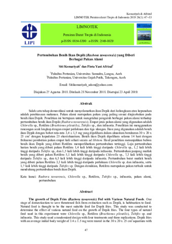 Siti, Komariyah and Finta, Yani Afrizal (2019) Pertumbuhan benih ikan Depik (Rasbora tawarensis) yang diberi berbagai pakan alami. Limnotek : Perairan Darat Tropis di Indonesia, 26 (1): 5. pp. 47-53. ISSN 2549-8029