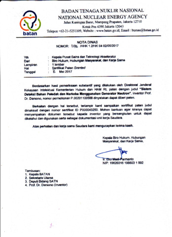 Menteri hukum dan hak azasi manusia Republik Indonesia. Direktur jendral kekayaan intelektual (2016) Sistem deteksi bahan peledak dan narkoba menggunakan generator neutron. IDP000043250.
