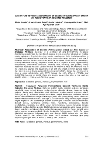 Elvira, Yunita and Cindy Ernica, Putri and Audia, Indrian and Liya Agustin, Umar and Diah Ayu Aguspa, Dita (2022) Literature review: Association of genetic polymorphism effect on risk events of diabetes mellitus. Jurnal Medika Malahayati, 6 (4): 1. 403 -410. ISSN 2355-6757