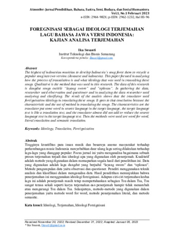 Ika, Susanti (2023) Foregnisasi sebagai ideologi terjemahan lagu bahasa Jawa versi Indonesia: kajian analisa terjemahan. Atmosfer: Jurnal Pendidikan, Bahasa, Sastra, Seni, Budaya, dan Sosial Humaniora, 1 (1). pp. 83-96. ISSN 2962-1232