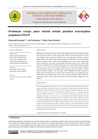 Romiyadi, Romiyadi and Adi, Febrianton and Widya, Sinta Mustika (2022) Pembinaan remaja putus sekolah melalui pelatihan keterampilan pengelasan SMAW. Journal of Community Service in Science and Engineering, 1 (1): 2. pp. 5-8. ISSN 2962-1003