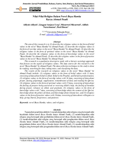Alfiyah, Alfiyah and Linggua, Sanjaya Usop and Misnawati, Misnawati and Alifiah, Nurachmana and Paul, Diman (2023) Nilai-nilai religius dalam novel Buya Hamka karya Ahmad Fuadi. Atmosfer: Jurnal Pendidikan, Bahasa, Sastra, Seni, Budaya, dan Sosial Humaniora, 1 (1). pp. 184-200. ISSN 2962-1232