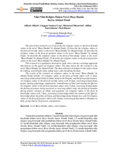 Tujuan dari penelitian adalah (1) mendeskripsikan nilai religius yang berwujud nilai keyakinan dalam novel Buya Hamka karya Ahmad Fuadi, (2) mendeskripsikan nilai religius yang berwujud nilai peribadatan dalam novel Buya Hamka karya Ahmad Fuadi, (3) mendeskripsikan nilai religius yang berwujud nilai penghayatan dalam novel Buya Hamka karya Ahmad Fuadi, (4) mendeskripsikan nilai religius yang berwujud nilai pengetahuan dalam novel Buya Hamka karya Ahmad Fuadi, (5) mendeskripsikan nilai religius yang berwujud nilai pengamalan dalam novel Buya Hamka karya Ahmad Fuadi.Penelitian ini merupakan penelitian deskriptif kualitatif dengan pendekatan sosiologi sastra yang memfokuskan pada aspek nilai religius. Sumber data dalam penelitian ini yaitu novel Buya Hamka karya Ahmad Fuadi. Teknik pengumpulan data dalam penelitian ini dilakukan dengan membaca, mencari data, mencatat, dan mengklasifikasikan data. Hasil penelitian nilai-nilai religius dalan novel Buya Hamka karya Ahmad meliputi: (1) nilai religius yang berwujud nilai keyakinan sebanyak 11 data, berupa data tentang iman kepada Allah, iman kepada Nabi, dan iman kepada qadha dan qadar, (2) nilai religius yang berwujud nilai peribadatan sebanyak 34 data berupa data tentang salat, puasa, haji, berdoa, berzikir, dan membaca Al-Qur’an, (3) nilai religius yang berwujud nilai penghayatan sebanyak 15 data, berupa data tentang perasaan doa-doanya terkabul atau mendapat pertolongan Allah, perasan khusyuk ketika berdoa, bertawakal, dan bersyukur (4) nilai religius yang berwujud nilai pengetahuan sebanyak 7 data, berupa data pengetahuan tentang isi Al-Qur,an, pengetahuan tentang rukun Islam, dan pengetahuan tentang hukum Islam, dan (5) nilai religius yang berwujud nilai pengamalan sebanyak 16 data, berupa data tantang suka menolong, sedekah, pemaaf, dan sabar.