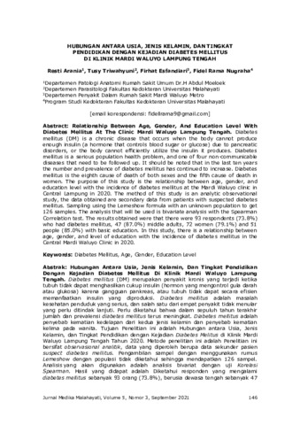 Resti, Arania and Tusy, Triwahyuni and Firhat, Esfandiari and Fidel Rama, Nugraha (2021) Hubungan antara usia, jenis kelamin, dan tingkat pendidikan dengan kejadian diabetes mellitus di klinik Mardi Waluyo Lampung Tengah. Jurnal Medika Malahayati, 5 (3): 3. 146 -153. ISSN 2355-6757