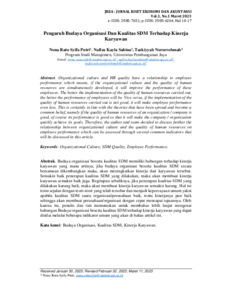 Budaya organisasi beserta kualitasSDM memiliki hubungan terhadap kinerjakaryawan yang mana artinya, jika budaya organisasi beserta kualitas SDM secarabersamaan dikembangkan maka, akan meningkatkan kinerja dari karyawan tersebut.Semakin baik penerapan kualitas SDM yang dilakukan, maka akan membuat kinerjakaryawan semakin baik juga. Begitupun sebaliknya, jika penerapan kualitas SDM yangdilakukan kurang baik, maka akan membuat kinerja karyawan semakin kurang. Hal initentu sejalan dengan teori-teori yang telah tersebar dan menjadi kepercayaan umum yakniapabila kualitas SDM suatu organisasi/perusahaan baik, tentu kinerjanya pun baiksehingga akan membuat perusahaan/organisasi dengan cepat mencapai tujuannya. Olehkarena itu, penulis dan tim memutuskan untuk membahas lebih lanjut mengenaihubungan Budaya organisasi beserta kualitas SDM terhadap kinerja karyawan yang dapatdinilai melalui beberapa indikator umum yang akan di bahas artikel ini.
