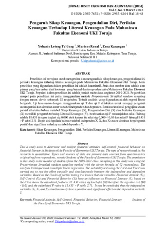 Yohanis, Lotong Ta’dung and Marinus, Ronal and Erna, Karangan (2023) Pengaruh sikap keuangan, pengendalian diri, perilaku keuangan terhadap literasi keuangan pada mahasiswa Fakultas Ekonomi UKI Toraja. Jurnal Riset Ekonomi dan Akuntansi, 1 (1). pp. 18-43. ISSN 2985-6264