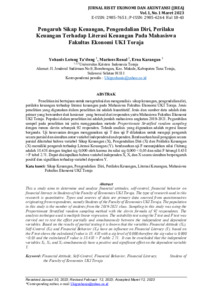 Penelitian ini bertujuan untuk mengetahui dan menganalisis sikap keuangan, pengendalian diri, perilaku keuangan terhadap literasi keuangan pada Mahasiswa Fakultas Ekonomi UKI Toraja. Jenis penelitian yang digunakan dalam penelitian ini adalah kuantitatif. Jenis dan sumber data adalah data primer yang bersumber dari kosioner yang berasal dari responden yaitu Mahasiswa Fakultas Ekonomi UKI Toraja. Populasi dalam penelitian ini adalah jumlah mahasiswa angkatan 2019-2021. Pegambilan sampel pada penelitian ini yaitu menggunakan metode Proportionate Stratified random sampling dengan rumus slovin sebanyak 92 responden. Teknik analisis yang digunakan adalah regresi linear berganda. Uji kesesuaian dengan menggunakan uji T dan uji F dilakukan untuk menguji pengaruh secara parsial dan simultan antar variabel independen dan dependen. Berdasarkan hasil pengujian secara parsial diketahui bahwa variabel Sikap Keuangan (X), Pengendalian Diri (X) dan Perilaku Keuangan (X) memiliki pengaruh terhadap Literasi Keuangan (Y). berdasarkan uji F menunjukkan nilai f hitung adalah 18.438 dengan tingkat sig 0,000 oleh karena itu nilai sig 0,000 < 0,05 dan nilai F hitung18.438 > F tabel 2.71. Dapat disimpulkan bahwa variabel independen X, X, dan X secara simultan berpengaruh positif dan signifikan terhadap variabel dependen Y.